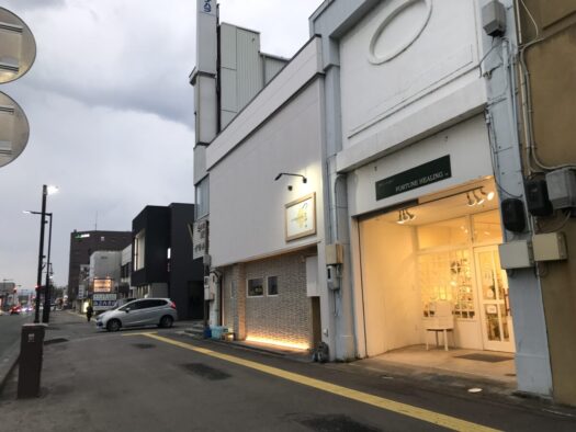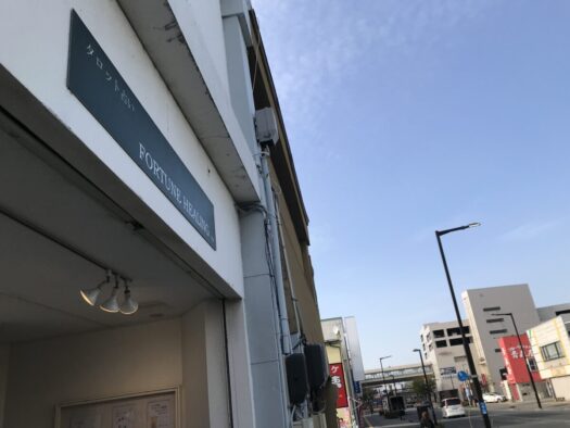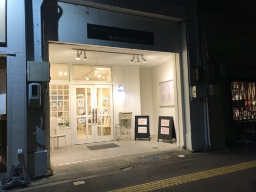 写真左側少し写っている道路が駅前通り、ハチミツ色のぽってり明るい灯りのお店が、タロット占いフォーチュンヒーリング です。深い緑色の看板が見えていますね。