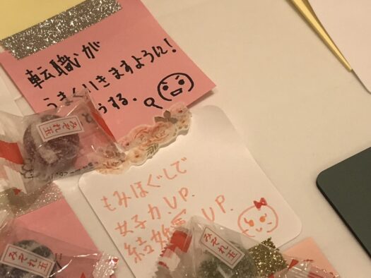 フォーチュンヒーリング さんのもみほぐしへ、風が強くて寒い夜に来てくださったお客様のメッセージカードが、お店に居てるうちにストンストンと剥がれてきたからとてもビックリ。