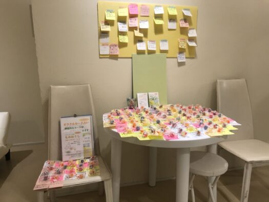 メッセージボードのカードは丸テーブルには収まりきれなくて、座面が大きい方の椅子に変えて置かせていただきました。